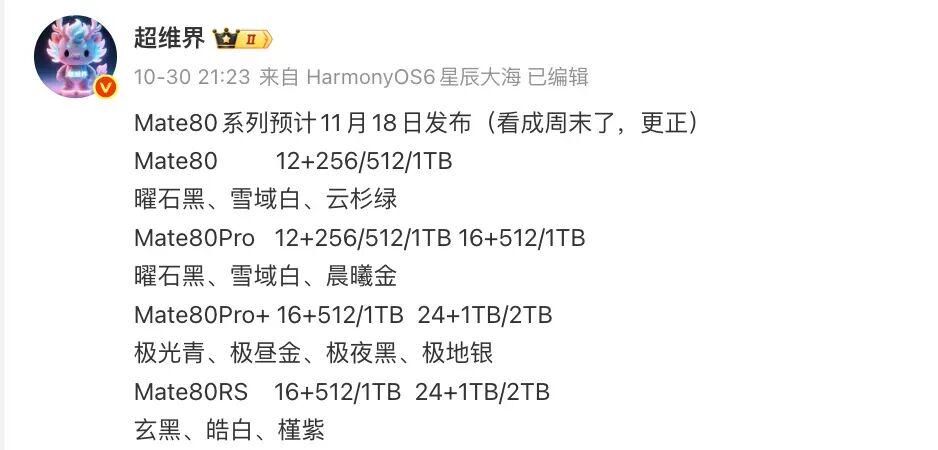 除了存储规格和颜色信息盛康配资,这份爆料中还提到“Mate80系列预计11月18日发布”。