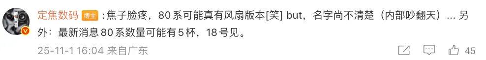 这位博主还补充称:“80系可能真有风扇版本 but,名字尚不清楚(内部吵翻天)... 另外:最新消息80系数量可能有5杯,18号见。”