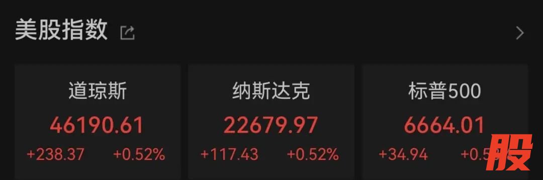 截至收盘,道指涨238.37点,涨幅为0.52%,报46190.61点;纳指涨117.43点,涨幅为0.52%,报22679.97点;标普500指数涨34.94点,涨幅为0.53%,报6664.01点。