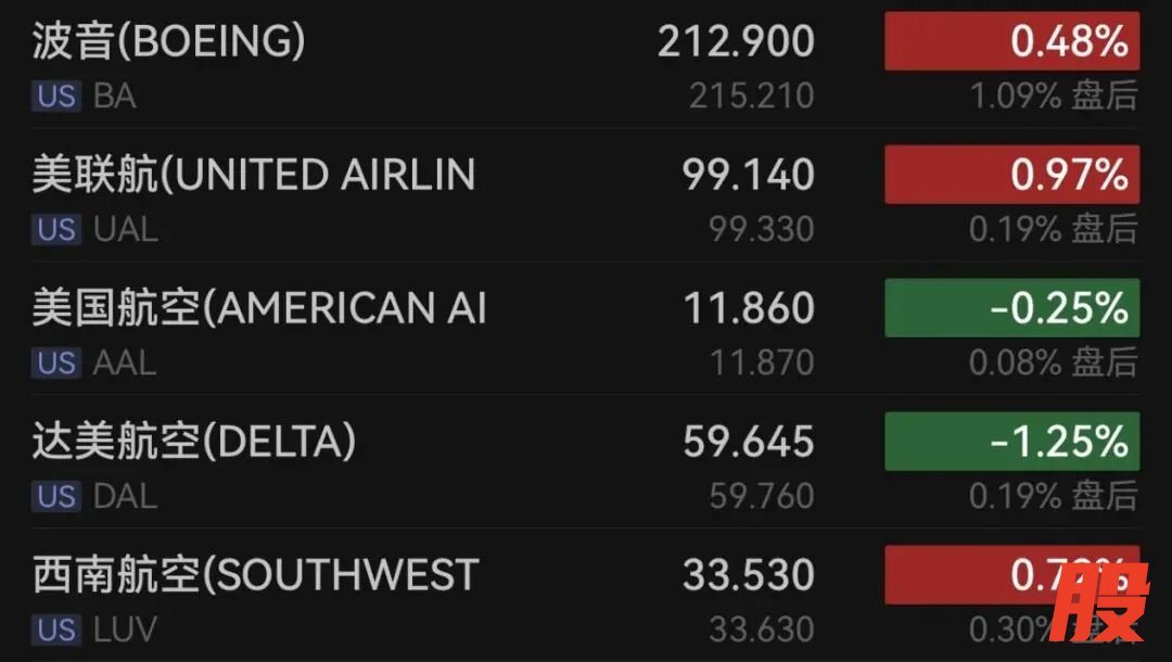 航空股涨跌不一,波音涨0.48%,美国航空跌0.25%,达美航空跌超1%,西南航空涨0.72%,美联航涨近1%。