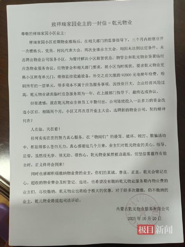 据了解,该小区的前物业公司内蒙古乾元物业服务有限公司于10月20日退场,并发布致祥瑞家园业主的一封信。据公开信内容:祥瑞家园前期物业撤场后,三月内多次召开会议未选聘新物业,物管会与乾元物业签临时应急服务协议,要求其完成单元门更换、监控维修等非应急服务事项,乾元因投入大请求一年服务期并达成协议。乾元投入百万元改造后仅两月,小区再开大会聘新物业,质疑没有契约精神,称遭“物闹”干扰,被迫退场。
